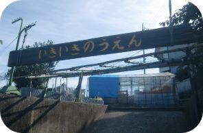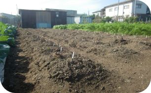 入口は朝日がまぶしい! サツマイモはベニハルカ