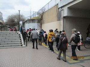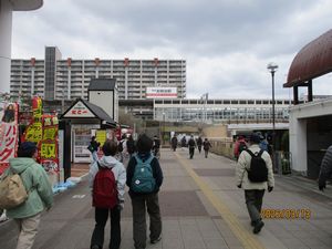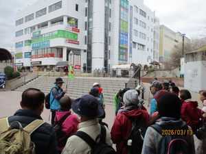 光明池駅前(左)、ウォーク出発前の説明(中)、光明池に向かって出発(右)